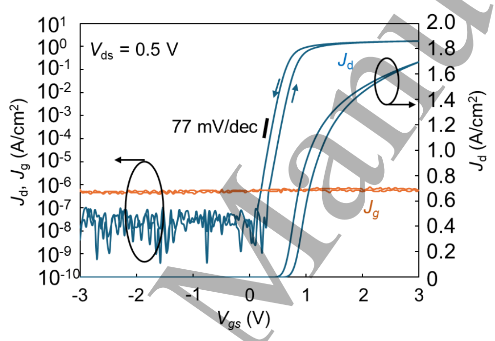 图 5. 多鳍 β-Ga2O3 垂直场效应晶体管的 Jd、Jg-Vgs 特性(对数/线性坐标),及亚阈值斜率。