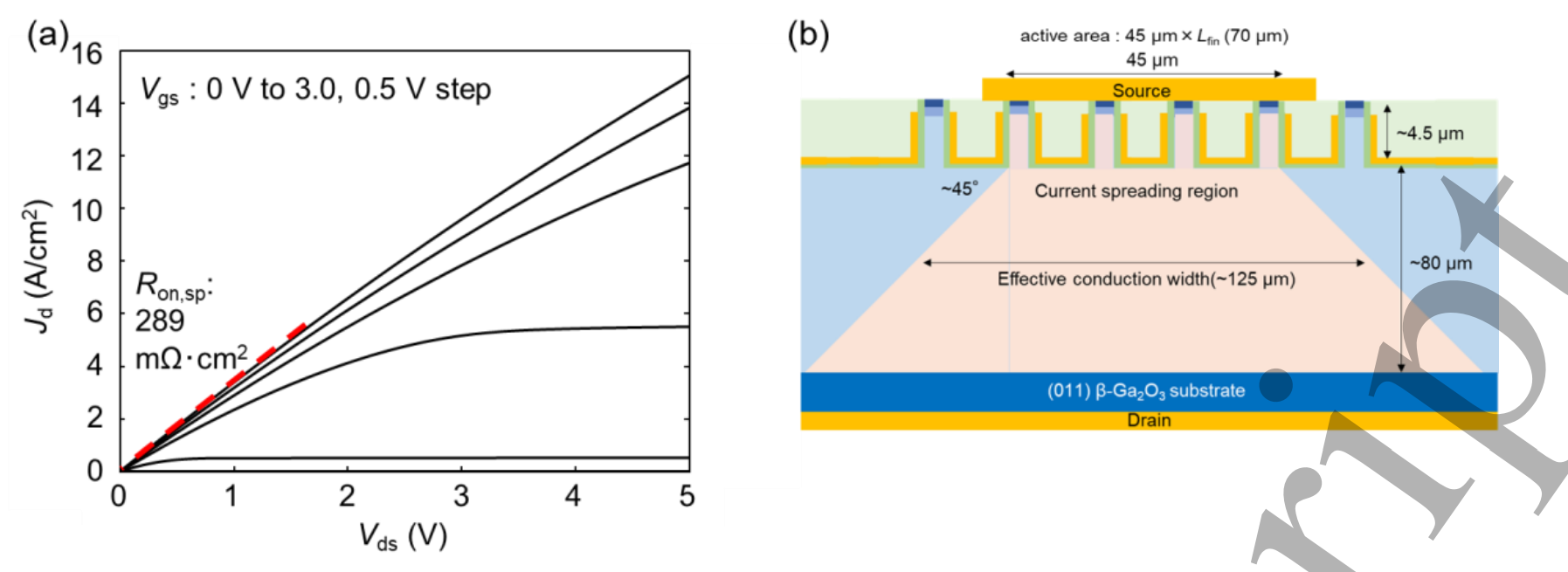 图 4. (a) 多鳍 β-Ga2O3 垂直场效应晶体管的 Jd-Vds 特性。 (b) 假设电流在漂移层中以 45° 角扩散的情况下,有效导电宽度的示意图。