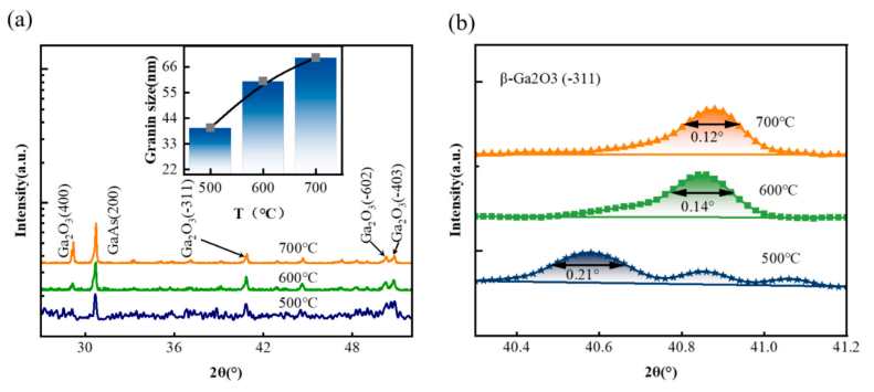图 1. (a)β-Ga2O3 的 XRD 图谱(插图:根据(-311)衍射峰计算出的晶粒尺寸);(b)β-Ga2O3 的 XRD(-311)衍射峰的半高宽比较。