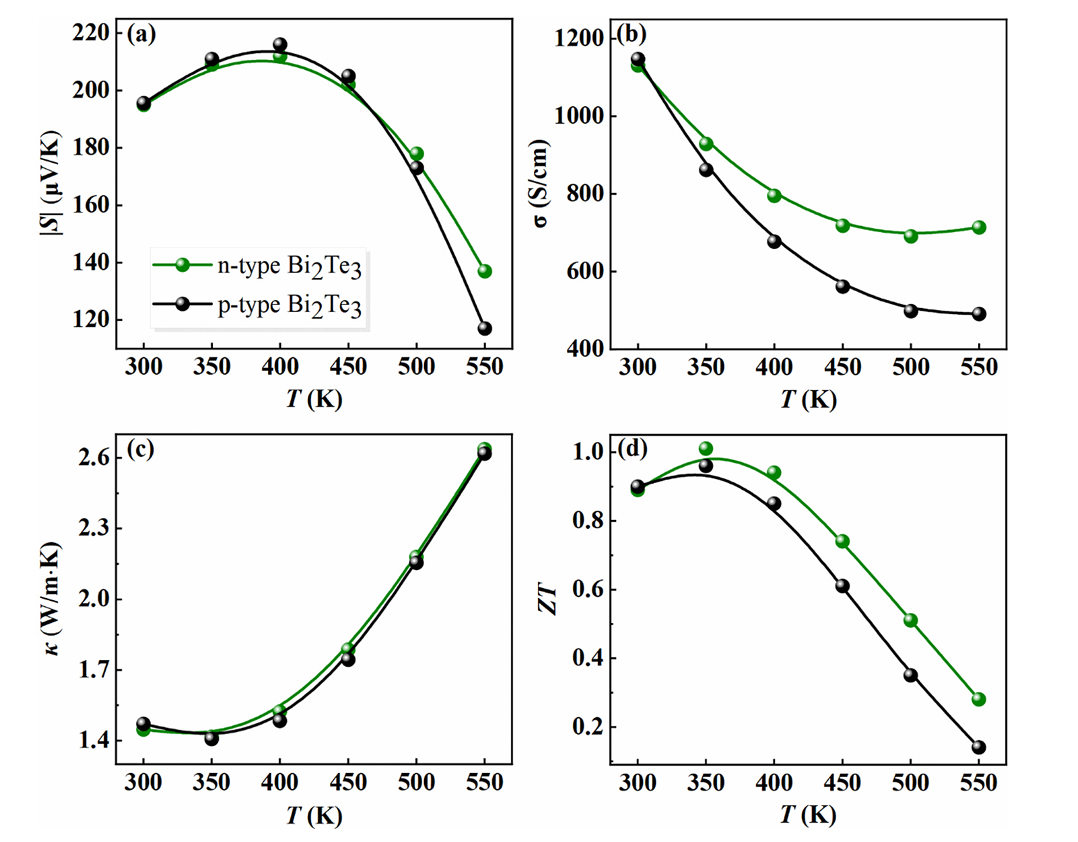 图 5. 不同温度下热电腿材料参数:(a) Seebeck 系数;(b) 电导率;(c) 热导率;(d) ZT 值。