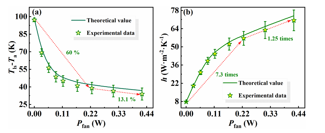 图 6. 风扇输入功率与以下因素的关系:(a) TEM 下表面与环境温差;(b) 热交换系数。