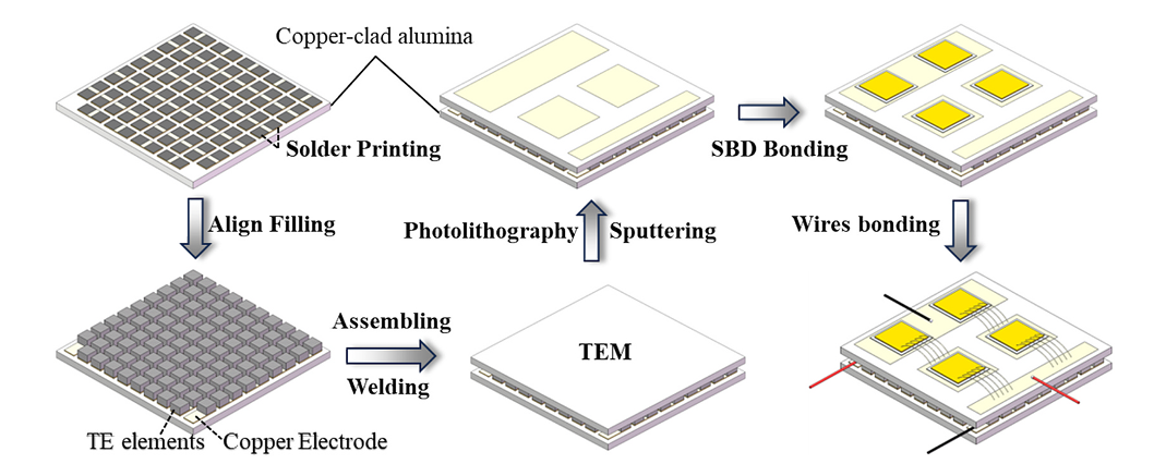 β-Ga2O3 作为一种典型的超宽禁带(UWBG)半导体,因其宽约 4.8 eV 的带隙、超过 8 MV/cm 的击穿电场以及低本征载流子浓度,展现出远优于 GaN 和 SiC 的耐压能力和热稳定性,因此在高功率电子领域引起了广泛关注。然而,β-Ga2O3 的低本征热导率(10–27 W•m-1•K-1)使得器件在高功率工作下易产生自热效应和局部热点,进而带来性能衰退和可靠性风险。这一热管理问题亟需解决。热电模块(TEM)凭借其同时具备发电(TEG)与制冷(TEC)功能的双向特性,为电子器件的余热回收和主动冷却提供了新思路。已有研究表明,TEG 可实现余热电能转化,TEC 则能够有效降低结温并改善器件性能。然而,现有工作在系统整体能量平衡、参数优化及双向热电集成设计方面仍存在不足。因此,本研究聚焦于 β-Ga2O3 功率器件的热管理难题,提出在 TEM 平台上集成肖特基势垒二极管(SBD),并结合 TEG 与 TEC 模式,实现余热回收与主动冷却的协同优化。该思路为构建高效、紧凑且自调节的热管理系统提供了理论依据与方法指导。