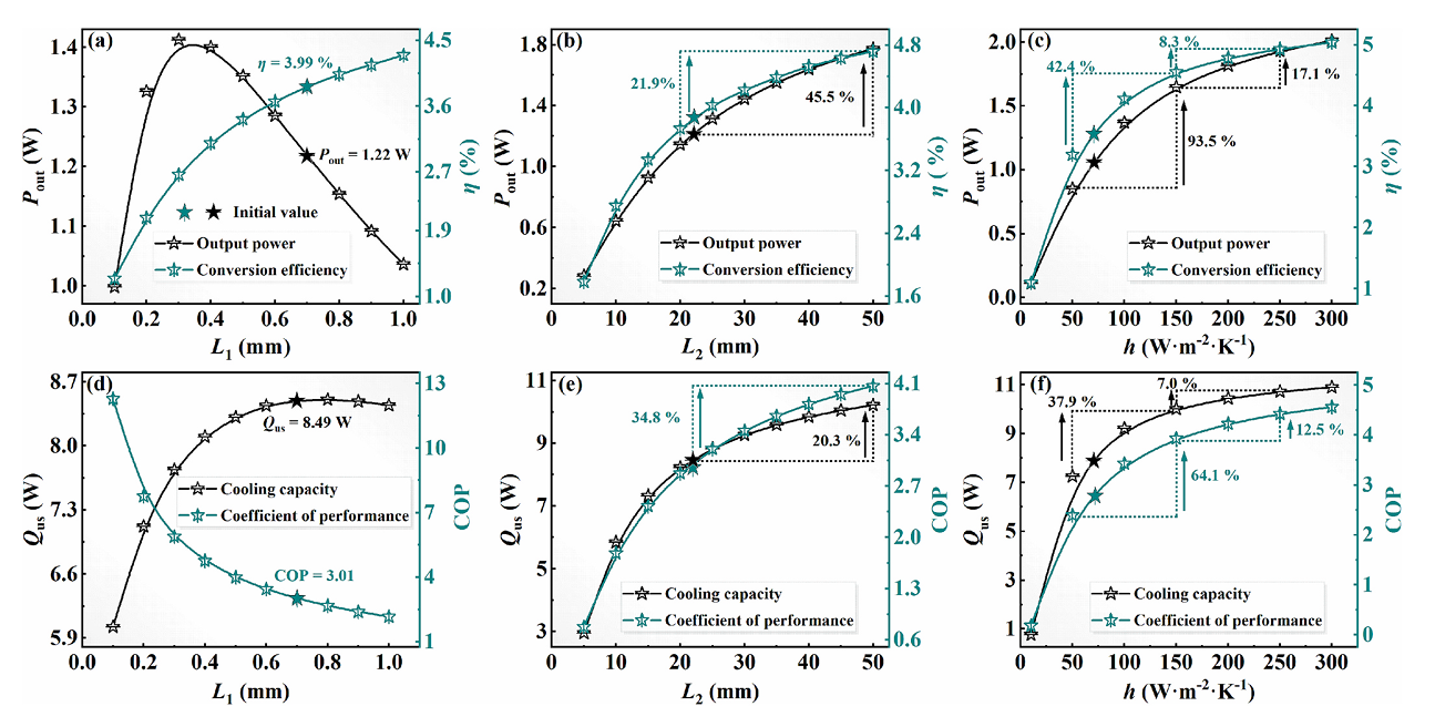 图 9. (a) 热电腿高度、(b) 散热片鳍片高度、(c) 热交换系数与 TEG 输出功率及转换效率的关系;(d) 热电腿高度、(e) 散热片鳍片高度、(f) 热交换系数与 TEC 制冷能力及性能系数(COP)的关系。