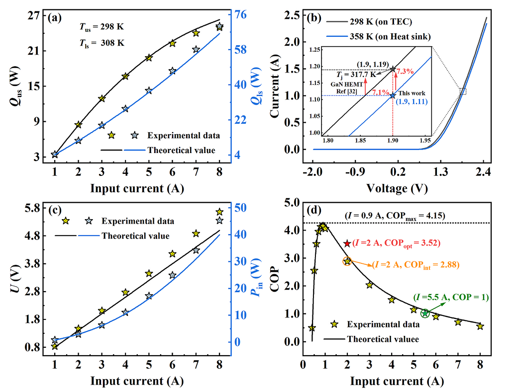 图 8. (a) TEC 上表面制冷能力与下表面热产生量随输入电流的变化关系;(b) 不同散热配置下 SBD 的电流-电压特性;(c) TEC 输入电流与输入电压及输入功率的关系;(d) TEC 输入电流与性能系数(COP)的关系。