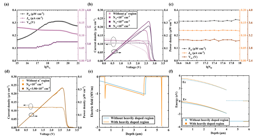 图3. (a) 输出功率密度(Pm)、短路电流密度(Jsc)和开路电压(Voc);(b) 电流密度-电压(J-V)与功率密度-电压(P-V)特性曲线;(c) p区掺杂浓度(Na)的电场分布。参数:Nd = 1016 cm−3,Hp = 4 μm,Hn = 2 μm。(d)Pm、Jsc与Voc,(e)J-V特性曲线,(f)热平衡状态下的能带图,均为与n区掺杂浓度(Nd)的函数关系。参数:Na = 1015 cm−3,Hp = 4 μm,Hn = 2 μm。