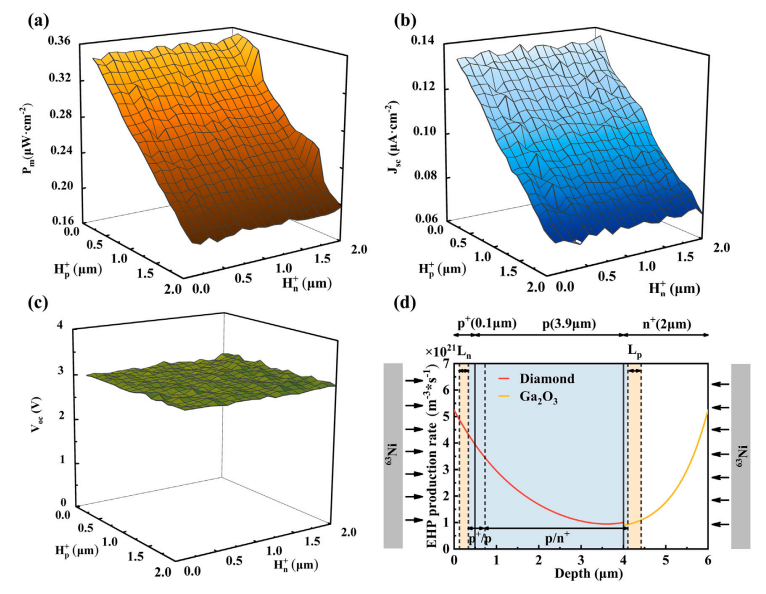 图 5. (a)Pm,(b)Jsc 以及(c)Voc 随 p+ 区厚度(Hp+)和 n 区厚度(Hn+)的变化。参数:NA = 1019 cm−3,Na = 1015 cm−3,Nd = 3.98×1016 cm−3,ND = 3.98×1017 cm−3,Hp = 4 μm - Hp+,Hn = 2 μm - Hn+。(d)优化后的单个金刚石/Ga2O3 异质结电池单元的二维结构图。参数:NA = 1019 cm−3,Na = 1015 cm−3,ND = 3.98×1017 cm−3,Hp+ = 0.1 μm,Hp = 3.9 μm,Hn+ = 2 μm。