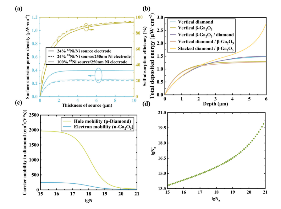 图2. (a) 不同镍源厚度下:(1) 250 nm镍电极上离散63Ni源(100%丰度)、(2) 250 nm镍电极上离散63Ni源(24%丰度)、(3) 集成63Ni/Ni(24%丰度)放射性源电极的视功率密度与能量损耗率。(b) 含63Ni源时,(1)垂直金刚石、(2)垂直Ga2O3、(3)金刚石/Ga2O3异质结、(4)堆叠式金刚石/Ga2O3异质结结构中的能量沉积分布。(c) 载流子迁移率与掺杂浓度的关系曲线。(d) 金刚石(Na-)中离子化受主浓度随受主浓度(Na)变化的曲线。