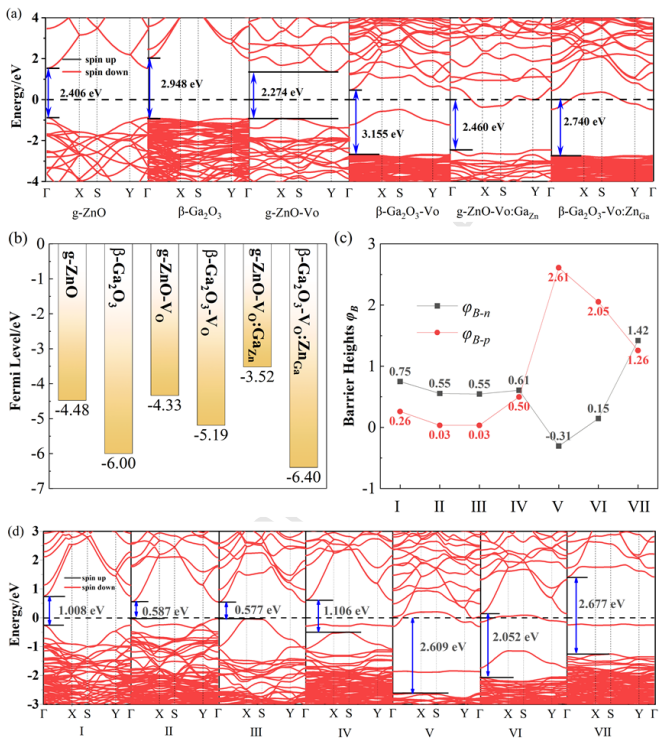 本研究阐明了氧空位(VO)和掺杂剂(GaZn、ZnGa)在调节 g-ZnO/β-Ga2O3 异质结光电特性中的关键作用。氧空位引入的中间能隙态阻碍载流子分离,而Ga/Zn掺杂则有效调节费米能级并改变内建电场,从而降低界面势垒并增强电荷传输。值得注意的是,g-ZnO-VO:GaZn/β-Ga2O3-VO 体系形成欧姆接触,实现载流子无阻碍流动。相比之下,g-ZnO-VO:GaZn/β-Ga2O3-VO:ZnGa 结构则形成 S 型异质结,促进高效电荷分离。这些发现凸显了缺陷工程在优化界面特性方面的潜力,为设计高性能自供电日盲光探测器提供了重要启示。
