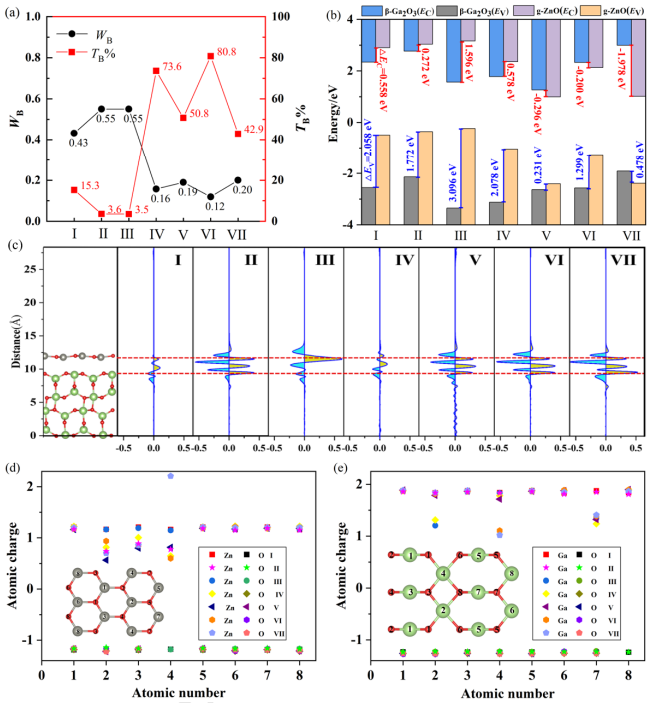 图4 (a) 隧道概率 TB 与势垒宽度 WB,(b) 能带偏移,(c) 电荷分布,(d) 和 (e) 所研究模型的巴德电荷分布