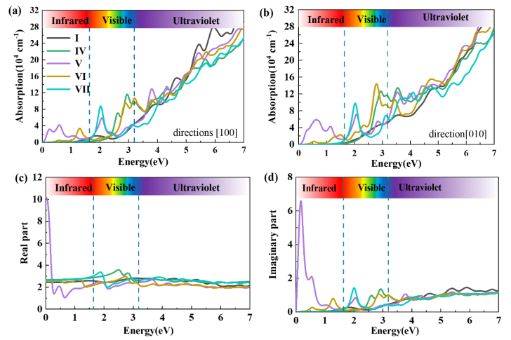 图5 (a) [100] 和 (b) [010] 的吸收光谱,(a) 实部和 (b) 虚部的介电常数。
