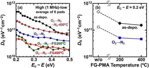 图4. (a) 采用 high (1 MHz)-low 法评估的 Ga2O3 MOS 结构中 Dit 分布。(b) EC−E=0.2 eV 时 Dit 随 FG-PMA 温度变化的关系曲线。