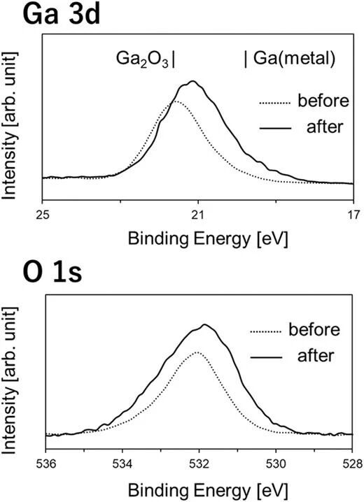 图4. β-Ga2O3 表面经 60 秒溅射处理前后 Ga 3d 和 O 1s 的 XPS 光谱。Ga 3d 峰位移及 Ga/O 峰面积比的变化表明表面发生化学改性,趋向于形成富镓表面。