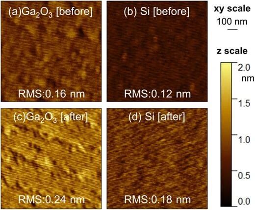 图5. β-Ga2O3 与 Si 表面的原子力显微镜图像:(a)和(b)为溅射前状态;(c)和(d)为 Si 表面溅射 40 秒后的状态。溅射后两表面均呈现原子级平整度。