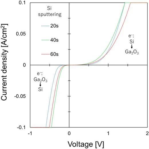 图7. 三种不同溅射条件下键合 β-Ga2O3/Si 试样的 I-V 特性曲线。溅射 40 秒时电导率表现最佳。