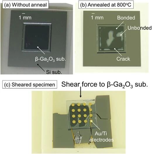 图6. β-Ga2O3/Si 衬底在 (a) 室温键合后及 (b) 800 ℃ 退火后的状态,退火导致出现未键合区域和裂纹。(c) 剪切试验中,断裂发生在 Si 衬底内部而非键合界面处。
