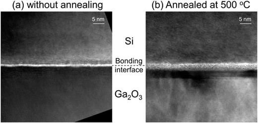 图10. β-Ga2O3/Si 界面在 500 ℃ 退火处理前后的透射电子显微镜图像。退火使硅表面晶格中观察到的畸变得以恢复,从而提高了电导率。