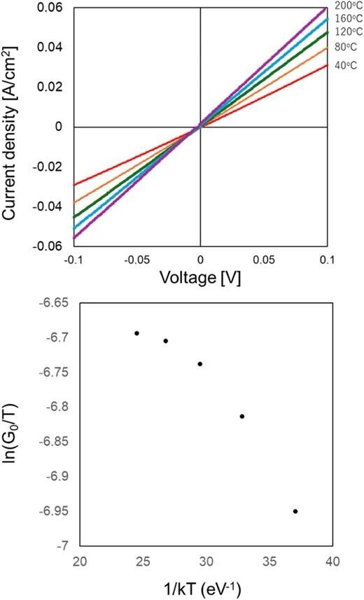 图9. 经 800 ℃ 退火处理的键合 β-Ga2O3/Si 样品的 I-V 特性温度依赖性。ln(G0/T)与 1/kT 的曲线呈非线性关系,表明热电子发射并非该样品中的主导传输机制。