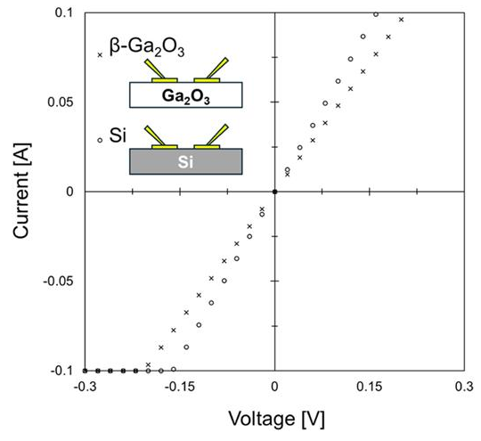 图2. 形成于 β-Ga2O3(十字)和 Si(圆圈)表面的 Au/Ti 接触垫的电流-电压(I-V)特性曲线,以确保欧姆接触。
