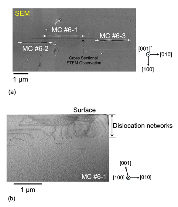 图 5. (a) 缺陷 #6 的 SEM 图像;(b) MC #6-1 的横截面 STEM 图像。位置及 STEM 观察方向如 (a) 所示。
