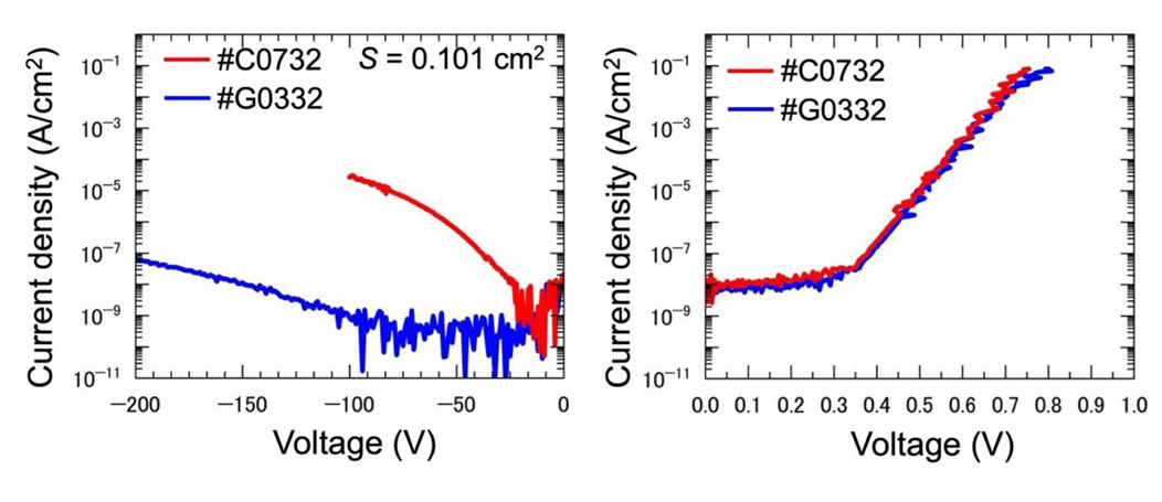 图 1. 同一晶圆上具有相同宽度(3200 μm,对应面积为 1.01 × 10-1 cm2)的方圆形(squircle)肖特基势垒二极管(SBD)#C0732(红色)和 #G0332(蓝色)的 I–V 特性曲线。