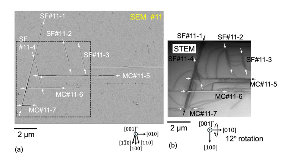 图 7. (a) 缺陷 #11 的 SEM 图像;(b) 缺陷 #11 绕 [010] 轴逆时针旋转 12° 的 STEM 明场图像。