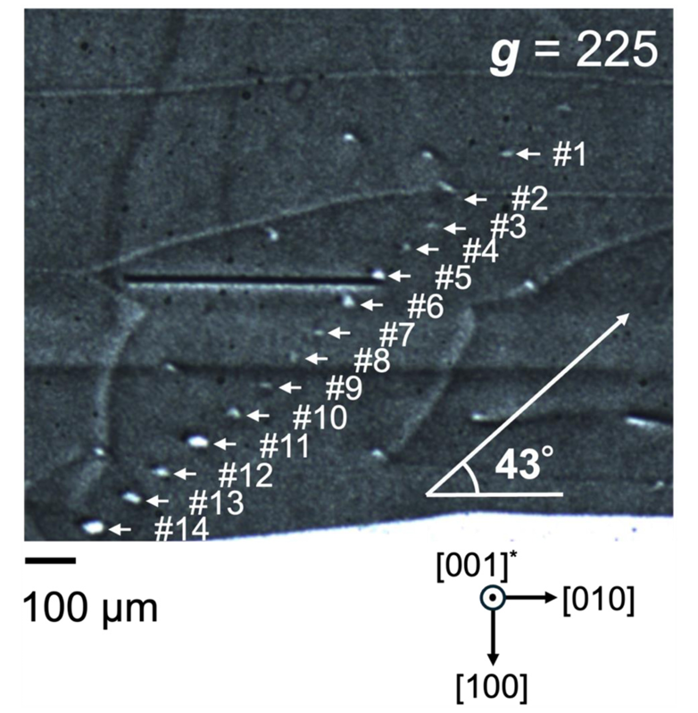 图 3. 对 SBD #C0732 进行 g = 225 衍射条件下的 X 射线拓扑图像。箭头所示为对齐缺陷的位置。