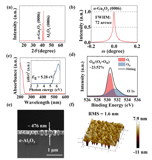 图1。(a)α-Ga2O3的XRD衍射图。(b)(0006)晶面的XRD摇摆曲线。(c)α-Ga2O3的紫外–可见吸收光谱。(d)α-Ga2O3的O 1s峰XPS光电子能谱。(e)α-Ga2O3/α-Al2O3界面的截面SEM图像。(f)表面AFM图像。