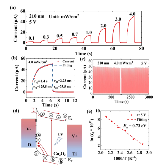 图3。(a)器件在不同光强下的光电流–时间(I–t)曲线。(b)单个开关循环的拟合曲线。(c)深紫外光探测器在300次工作循环中的开关特性。(d)深紫外光探测器的能带示意图。(e)暗电流激活能的提取结果。