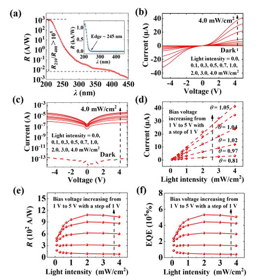图2。(a)在5 V偏压和4 mW/cm2 光强下α-Ga2O3光探测器的光响应光谱。(b)器件的线性坐标I–V曲线;(c)对数坐标I–V曲线。(d)不同电压下光电流与光强之间的函数关系。(e)不同偏压下器件的响应度R;(f)不同偏压下器件的外量子效率(EQE)随光强变化的关系。