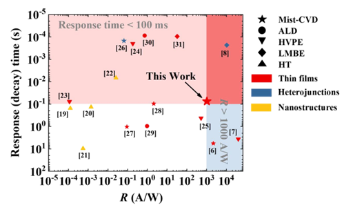 图4。 所制备的 α-Ga2O3 光探测器的响应时间与响应度对比基准图。